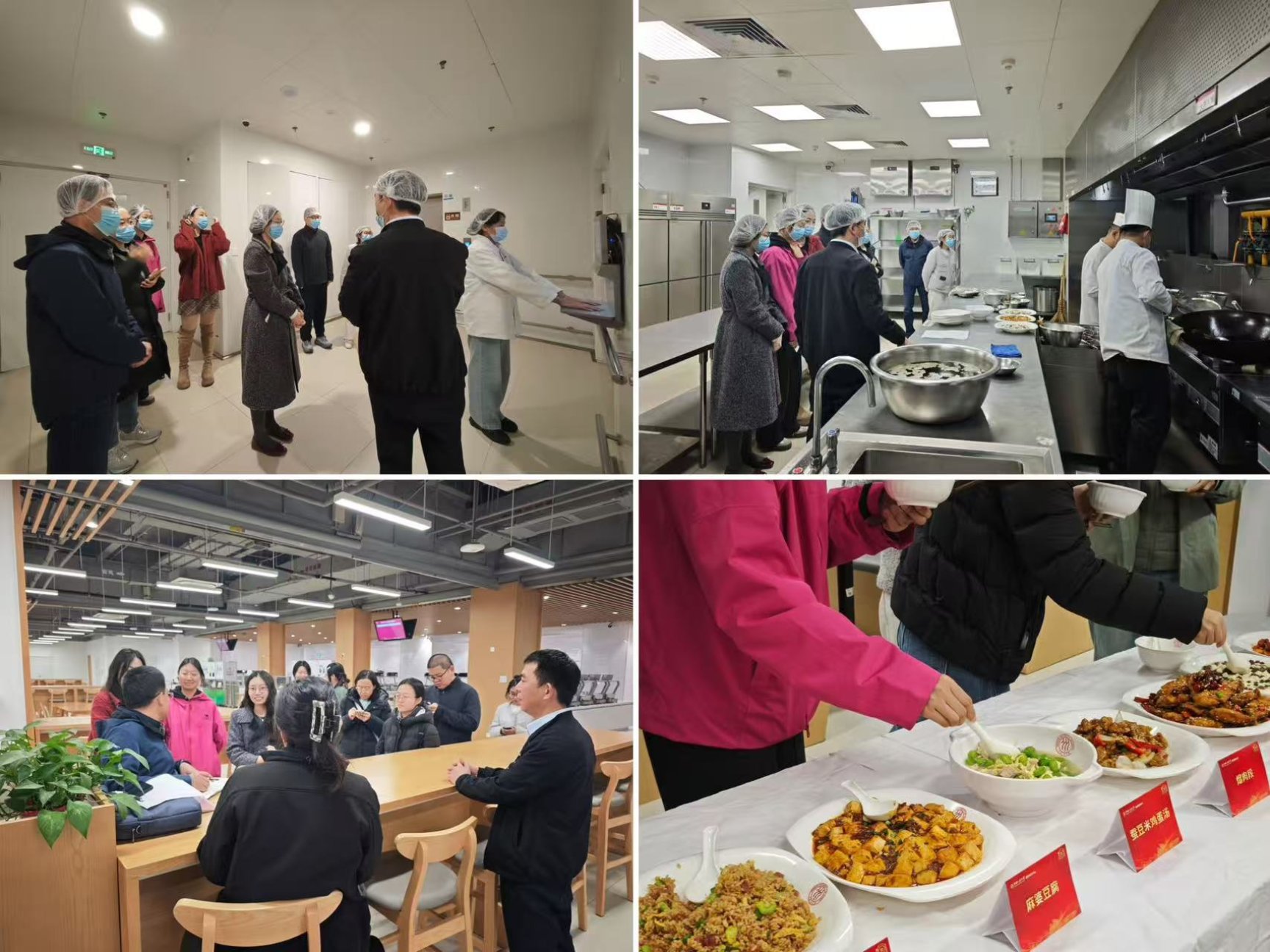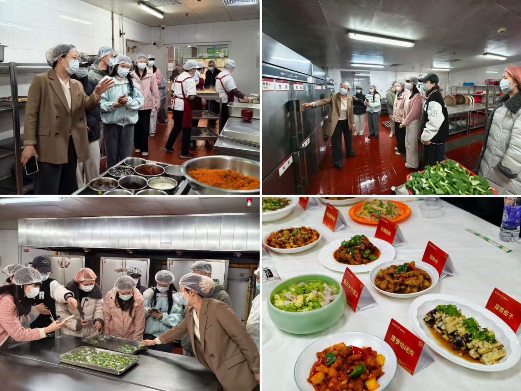 本次活动设置“沉浸式参观食堂后厨”和“基本大伙菜品品鉴”两大核心环节。当日下午,通州校区北区食堂、中关村校区中区食堂先后开展活动。在食堂负责人与工作人员的全程带领与讲解下,参与报名的师生依次走进食品加工间、烹饪区、餐具清洗消毒区等,完整观摩了食材从净菜处理、分类切配、规范烹饪到备餐出餐的全流程制作环节,了解餐具清洗,后厨卫生清洁、从业人员健康管理等工作内容。师生代表边走边看,针对想了解的问题现场沟通。
