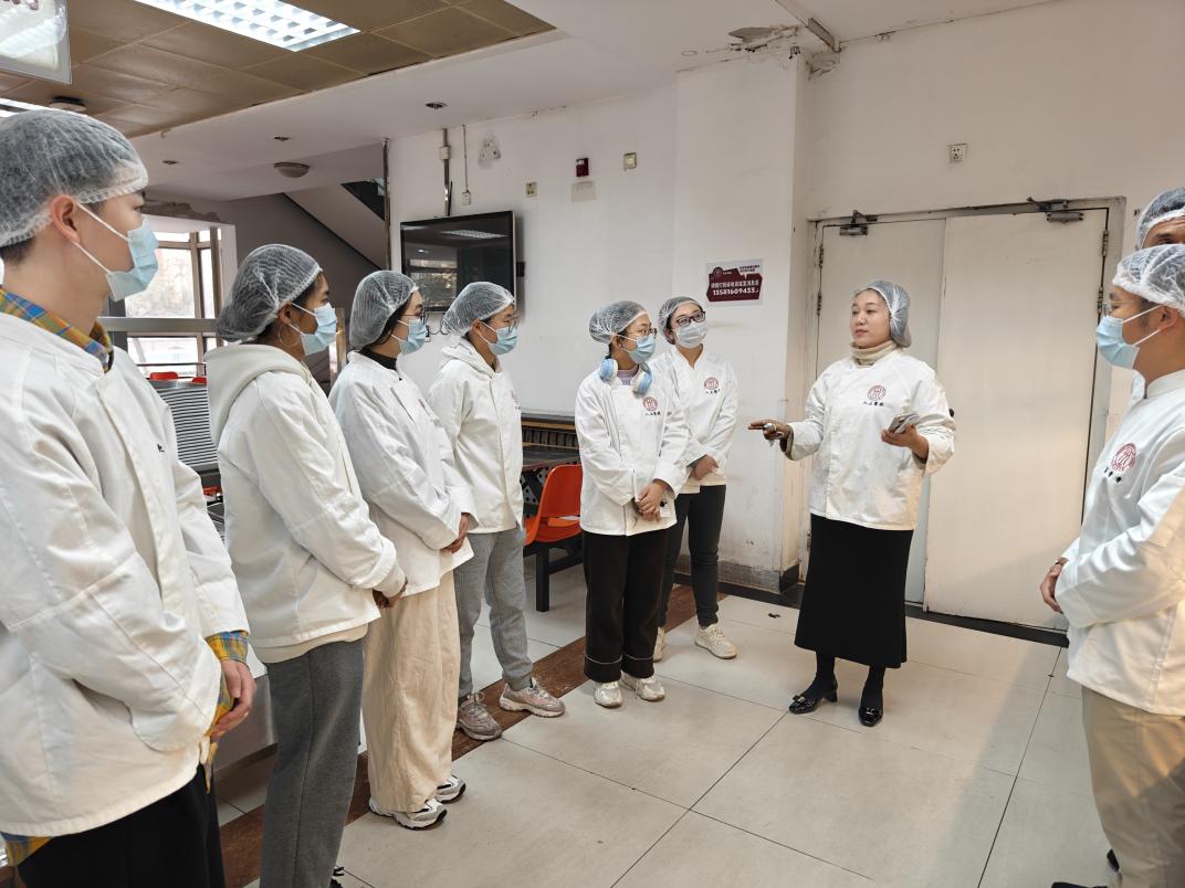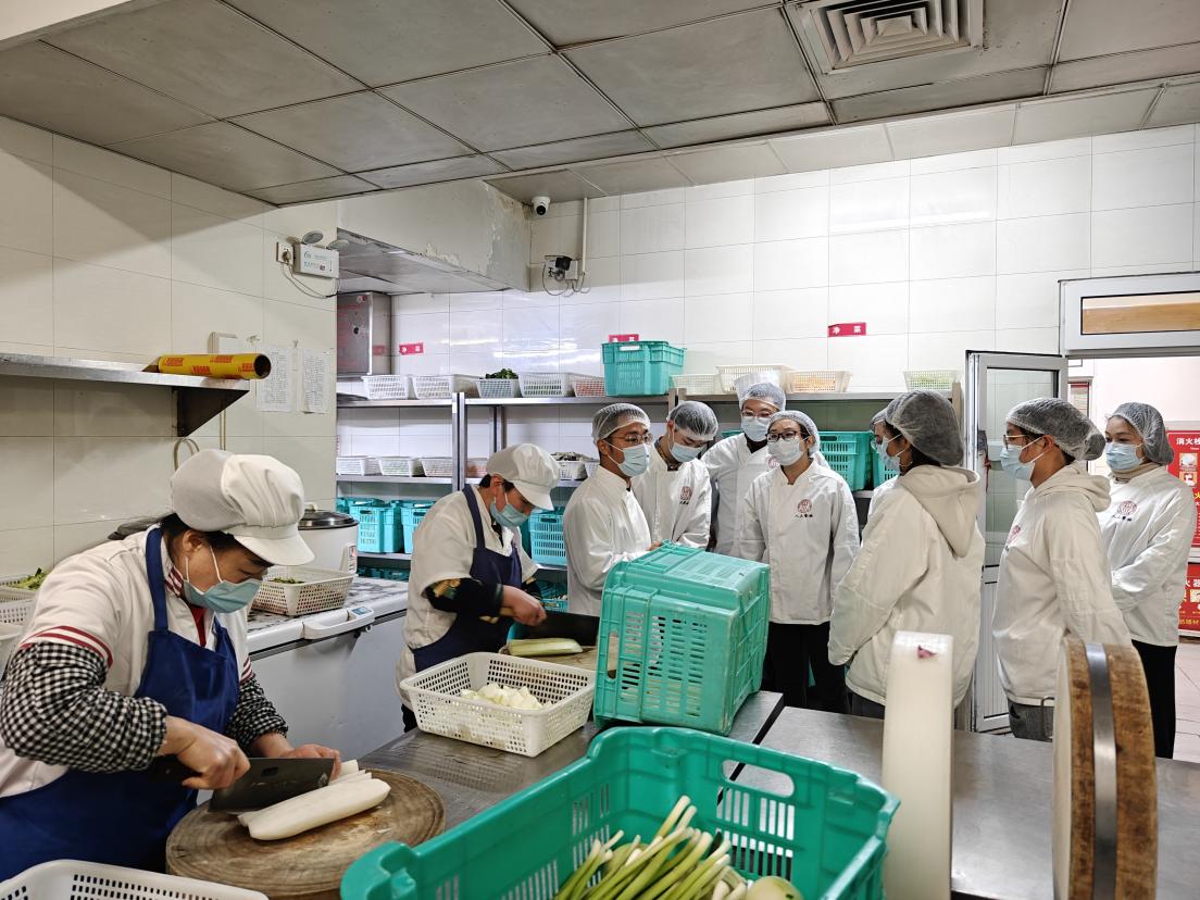 活动中,师生代表在食堂负责人姜青青引导下,实地探访了食品原料拆包区、食品加工区、餐具洗消间、烹饪操作间及出品窗口等关键区域。姜青青围绕“餐内异物防控”这一焦点问题,系统展示了从食品原料验收、清洗、处理、烹饪制作到餐具清洗、饭菜出品、人员卫生管理的全流程管理链条。重点介绍了包括食品原料智能秤、食品加工设备设施、食品储存分类、后厨防尘防护等多重防控措施,以及日常巡检、员工培训等常态化管理机制。师生通过亲眼观察、亲身体验,对食堂严谨的操作规范和系统的安全保障有了更直观地认识。