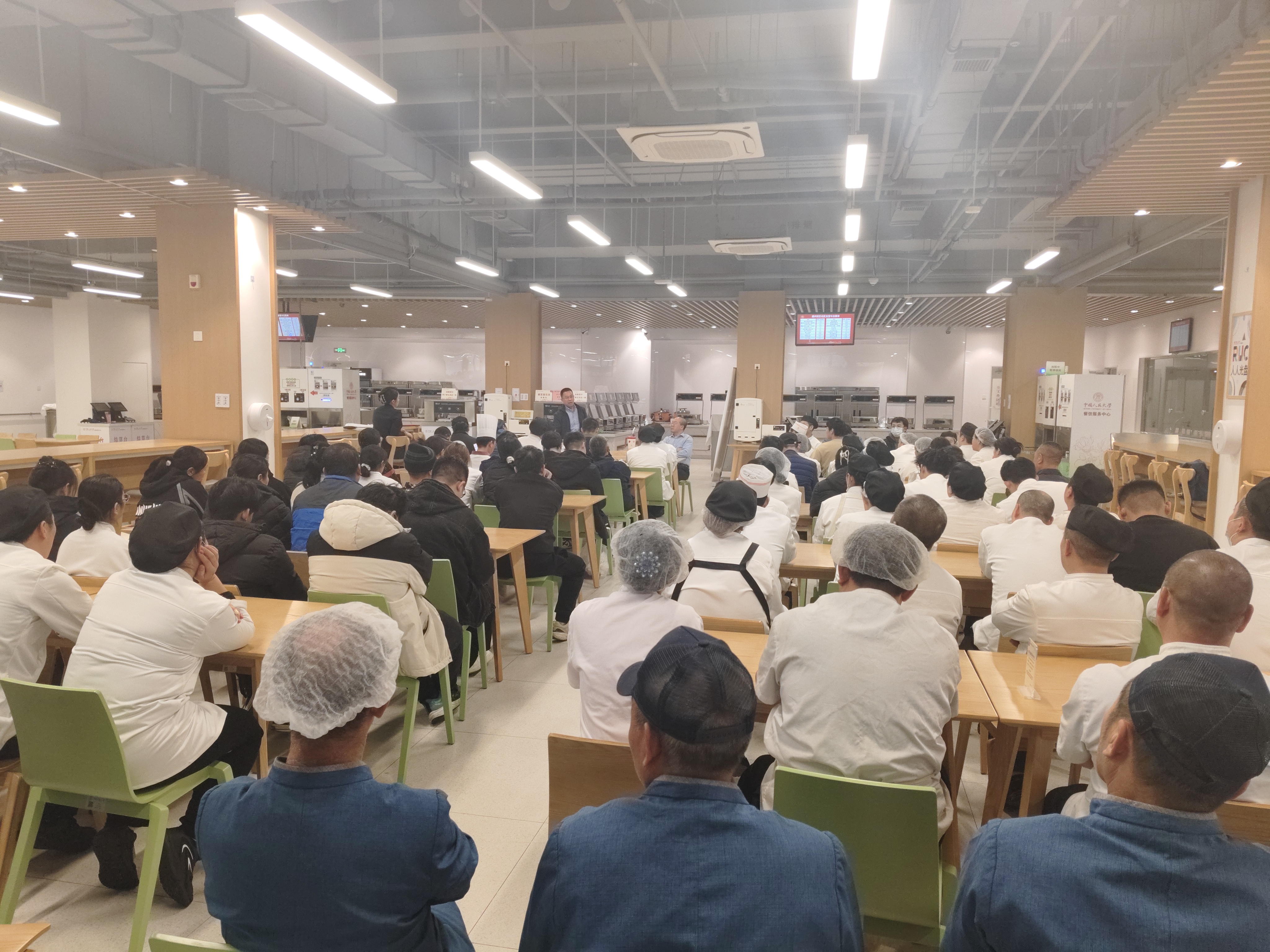 时间:2025-11-11 来源:餐饮服务中心为夯实食堂安全管理基础,提升从业人员专业素养与责任意识,11月6日下午,餐饮服务中心在通州北区食堂一层组织开展了“食堂从业人员法治安全与职业素养”主题培训。餐饮服务中心副主任种王峰、安全质量监管项目部孙启涛担任主讲,通州校区项目部95名食堂员工参加了培训。
