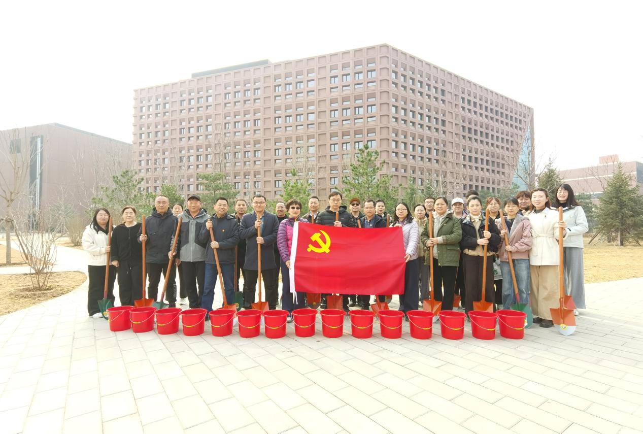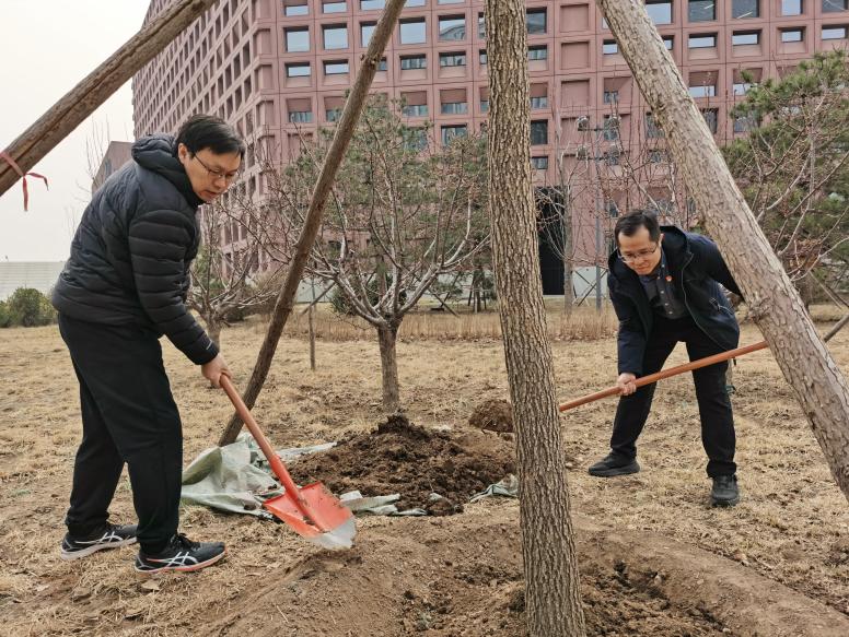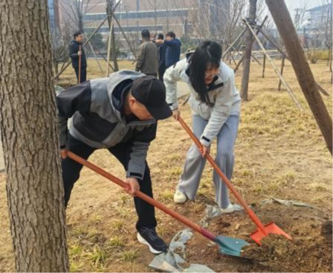 活动现场春意盎然,一派热火朝天的劳动景象。大家手持铁锹,分工协作、默契配合。有的挥锹铲土、有的扶苗稳树、有的培土围堰,每一个环节都细致认真、井然有序。大家一同俯身劳作,亲手为新苗培土浇水,用实际行动传递着爱绿护绿的责任与担当。一株株新栽的树苗扎根沃土、迎风而立,与周边的建筑相映成趣,为校园增添了一抹清新的绿意与蓬勃的生机。