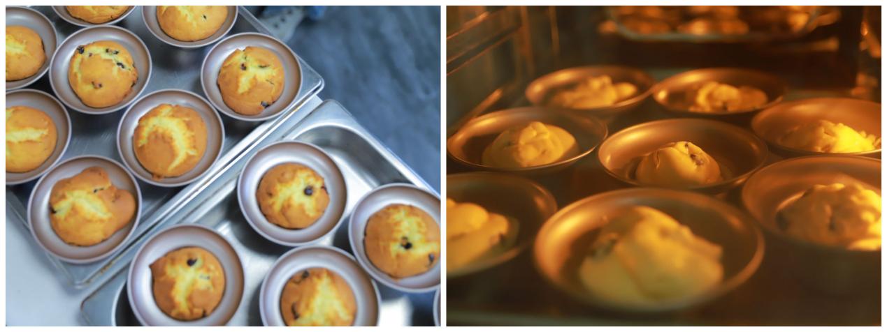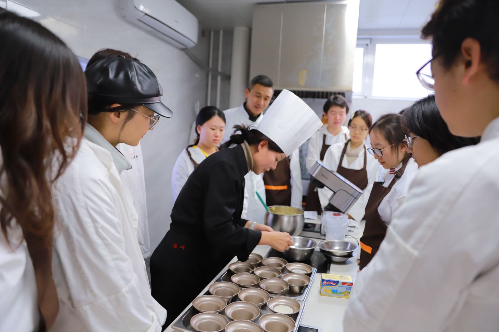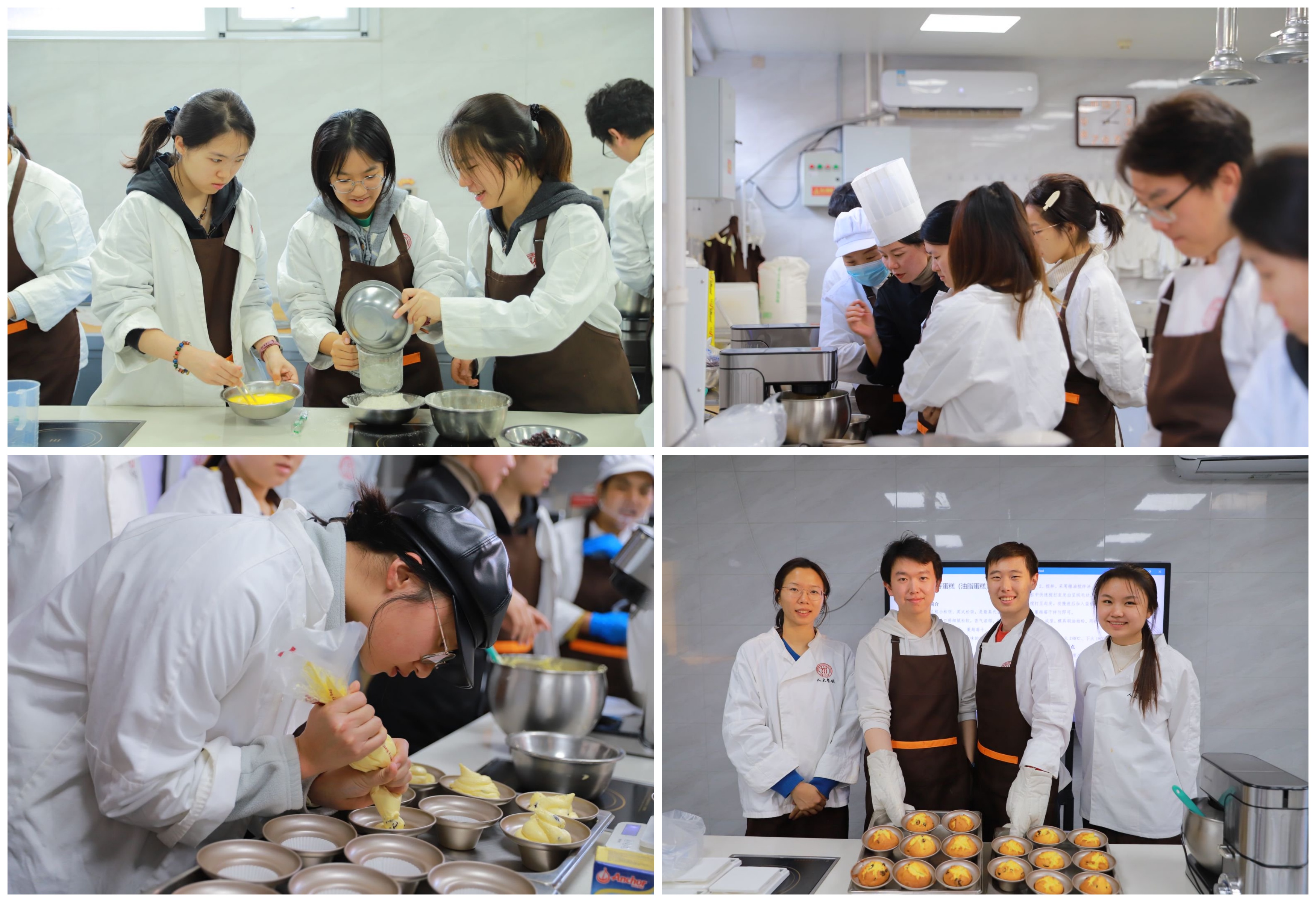 餐饮服务中心东区食堂项目组负责人陈巧从演示玛芬蛋糕的制作和指导同学们进行实际操作两个环节开展实践教学,同学们见证了从食材到成品的过程,并在老师指导下分组协作烘焙蛋糕。